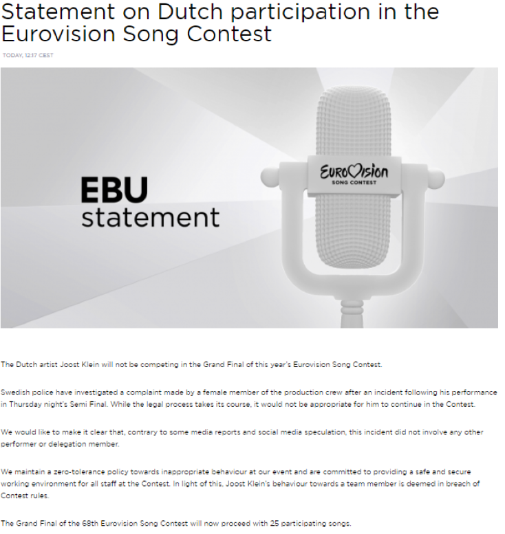 Διατηρούμε πολιτική μηδενικής ανοχής απέναντι σε ανάρμοστη συμπεριφορά στην εκδήλωσή μας και δεσμευόμαστε να παρέχουμε ένα ασφαλές και προστατευμένο περιβάλλον εργασίας για όλο το προσωπικό του Διαγωνισμού. Υπό αυτό το πρίσμα, η συμπεριφορά του Joost Klein προς ένα μέλος της ομάδας θεωρείται ότι παραβιάζει τους κανόνες του Διαγωνισμού.