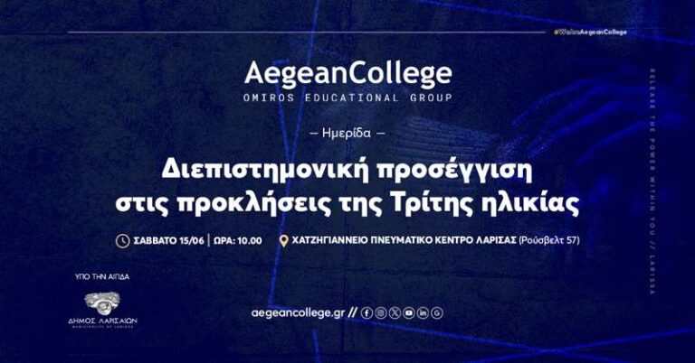 Η Σχολή Ανθρωπιστικών Σπουδών και η Σχολή Υγείας του Aegean College Λάρισας διοργανώνουν Ημερίδα με θέμα: «Η Διεπιστημονική προσέγγιση στις προκλήσεις της Τρίτης ηλικίας», το Σάββατο, 15 Ιουνίου 2024 και ώρα 10:00, στο Χατζηγιάννειο Πνευματικό Κέντρο Λάρισας (Ρούσβελτ 57), υπό την αιγίδα του Δήμου Λαρισαίων.