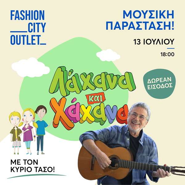 Το Σάββατο 13 Ιουλίου 18:00μμ-20:00μμ στο Fashion City Outlet, ο δημιουργός των τραγουδιών Λάχανα και Χάχανα και των ομώνυμων παιδικών θεατρικών παραστάσεων, ταξιδεύει τα παιδιά στο μουσικό σύμπαν της Λαχανοχαχανοχώρας.