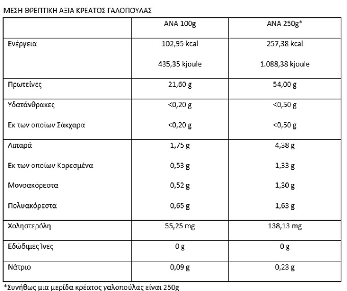 Ακολουθεί πίνακας με τη θρεπτική αξία της γαλοπούλας της Αμερικανικής Γεωργικής Σχολής