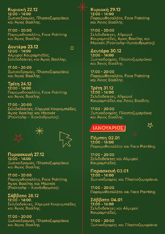 Αναλυτικά το πρόγραμμα των παιδικών δραστηριοτήτων από το Σάββατο 14 Δεκεμβρίου έως το Σάββατο 4 Ιανουαρίου έχει ως εξής.