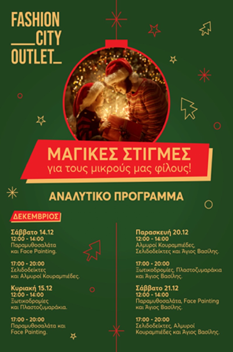 Ο μαγικός κόσμος των Χριστουγέννων στο Fashion City Outlet μας επιφυλάσσει καθημερινά καινούργιες εκπλήξεις με τις παιδικές δραστηριότητες να προσφέρουν ποικιλία δράσεων που ξετρελαίνουν τα παιδιά. Παραμύθια, θεατρικές παραστάσεις, face painting, φανταστικές δημιουργίες με τουβλάκια Lego, γράμματα στον Άγιο Βασίλη, φωτογραφίες με τον Άγιο Βασίλη, τον Ρούντολφ και τον Χιονάνθρωπο στον πιο ψυχαγωγικό χώρο της πόλης!