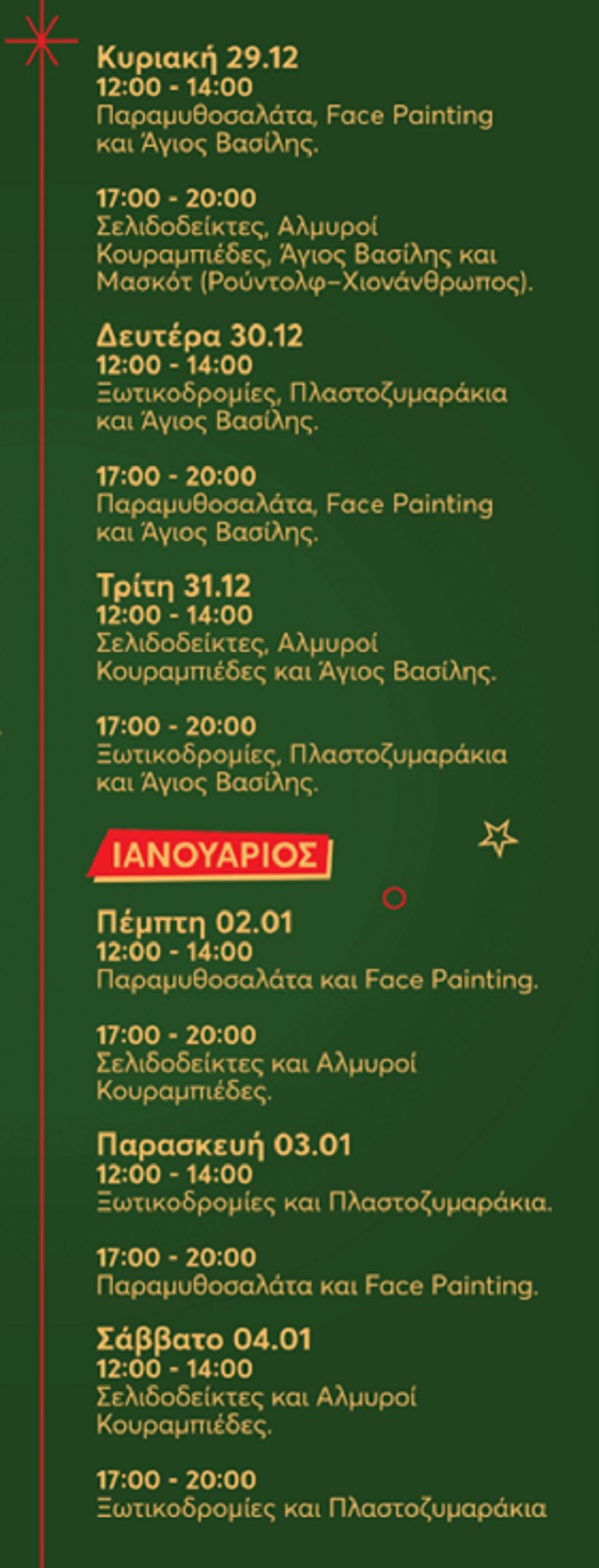 Αναλυτικά το πρόγραμμα των παιδικών δραστηριοτήτων (από 27/12/24 έως και 4/1/25) έχει ως εξής: