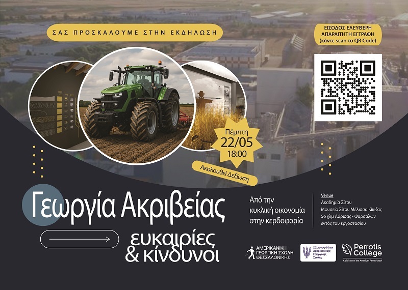Η γεωργία ακριβείας, η οικονομική στήριξη των αγροτών, οι κίνδυνοι και οι ευκαιρίες που παρουσιάζονται στον κλάδο, καθώς και η σχέση μεταξύ κυκλικής οικονομίας και κερδοφορίας στην αγροτική παραγωγή, θα βρεθούν στο επίκεντρο ενδιαφέρουσας ημερίδας που θα πραγματοποιηθεί στη Λάρισα την Πέμπτη 22 Μαΐου στις 18:00. Διοργανώνεται από τον Σύλλογο Φίλων της (ιστορικής) Αμερικανικής Γεωργικής Σχολής και θα φιλοξενηθεί στις εγκαταστάσεις της Ακαδημίας Σίτου – Μουσείο Σίτου Μέλισσα Κίκιζας που βρίσκεται στο 5ο χλμ Λάρισας-Φαρσάλων.