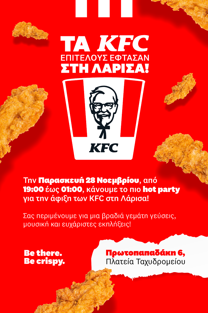 Τα νέα KFC Λάρισας σας περιμένουν με το πιο νόστιμο, fun και crispy opening party της χρονιάς. Μη λείψει κανείς!